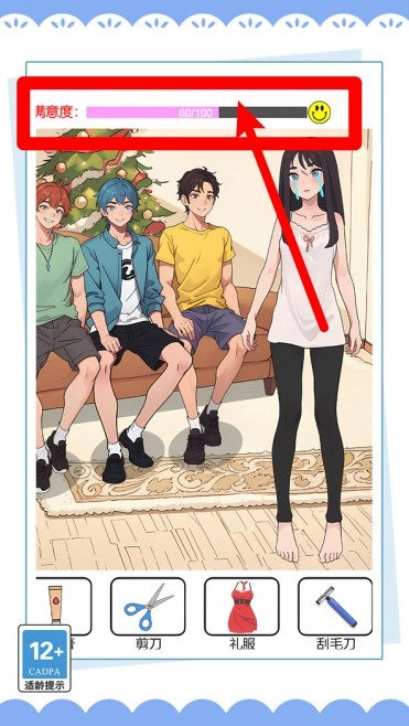 2. 讨好值系统的设定颇为巧妙:当女主被三位男生注视时,屏幕上持续变动的“满意度”进度条会隐隐透露出剧情的走向,整体带着一丝恋爱喜剧的轻松氛围。