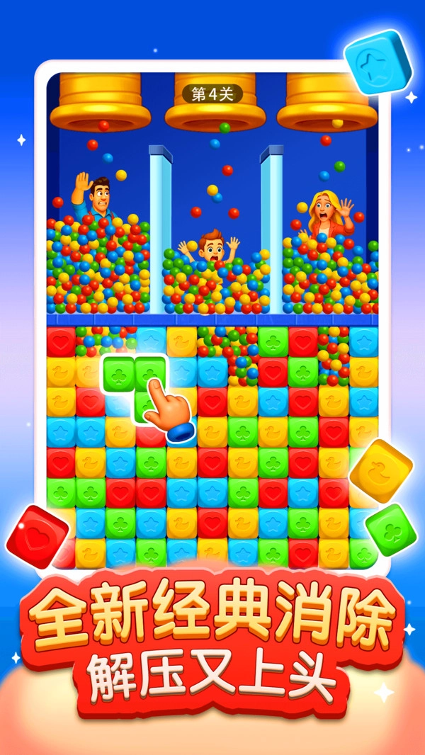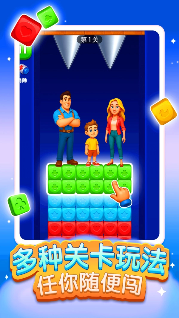 《拯救一家三口》消消乐正版安装版是一款别具一格的合作解谜游戏。故事围绕着被困在神秘方块所构建的巨型密室中的一家三口展开,父母与孩子需同心协力,借助消除特定方块、机关来打通逃生通道,最终成功脱离困境。该游戏融合了消除玩法、物理谜题与剧情叙事元素,对玩家的逻辑思维能力提出了考验。