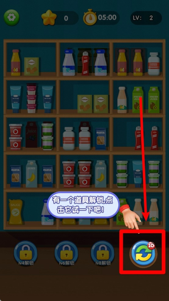 2. 点击右下角的刷新按钮能够重新整理货架上的道具,要是遇到没有合成空间或者道具堵塞的情况就可以使用它,这样能帮助解锁更多的组合机会。