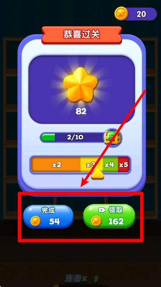 3. 通关后有两种选择:直接领取金币,或者观看广告让奖励翻倍。绿色按钮对应的是加倍获取金币的选项,拥有的金币数量越多,对提升游戏进度和效率的帮助就越大。