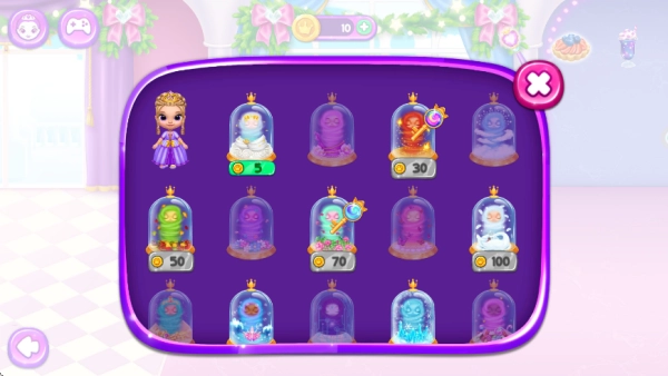 像下图展示的那样,点击画面左上角的娃娃图标,就能花费金币购买各式各样的公主娃娃。