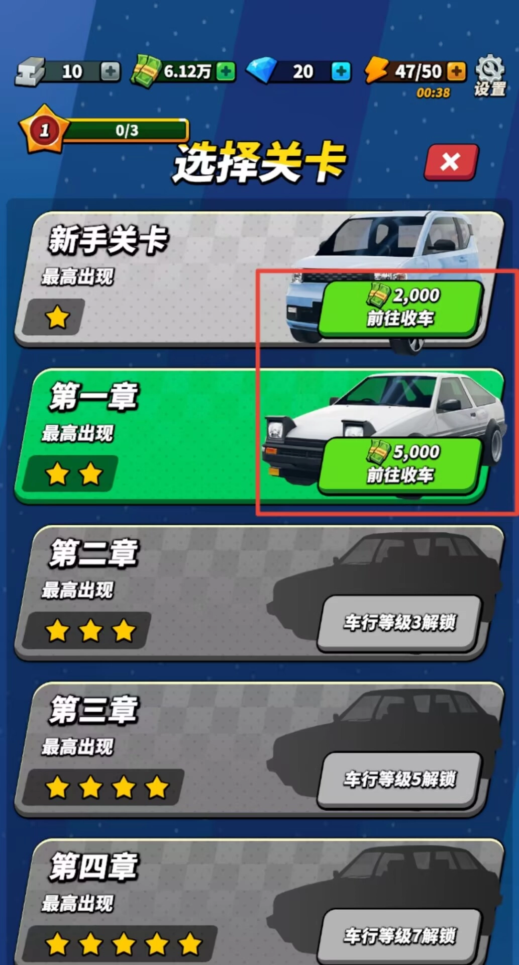 1、从主界面左下角的收购功能入口进入关卡选择页面,该页面涵盖新手教学和正式章节内容,选定对应的关卡后即可开启收车流程。