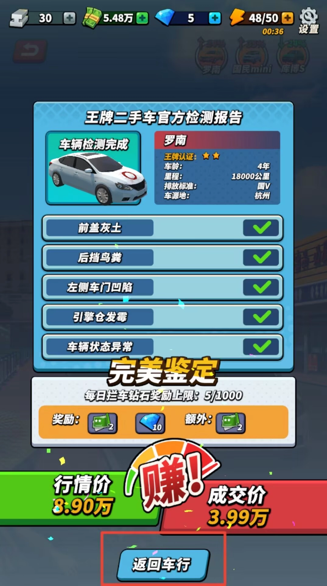 3、完成交易后进入结算界面,完美鉴定可获得稀有宝石和资金奖励,确认后返回车行继续经营。