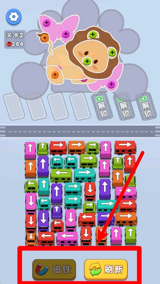 1.点击右下角的“刷新”按钮可重新排列车阵,使玩家更容易找出可行路径并收集指定螺丝。