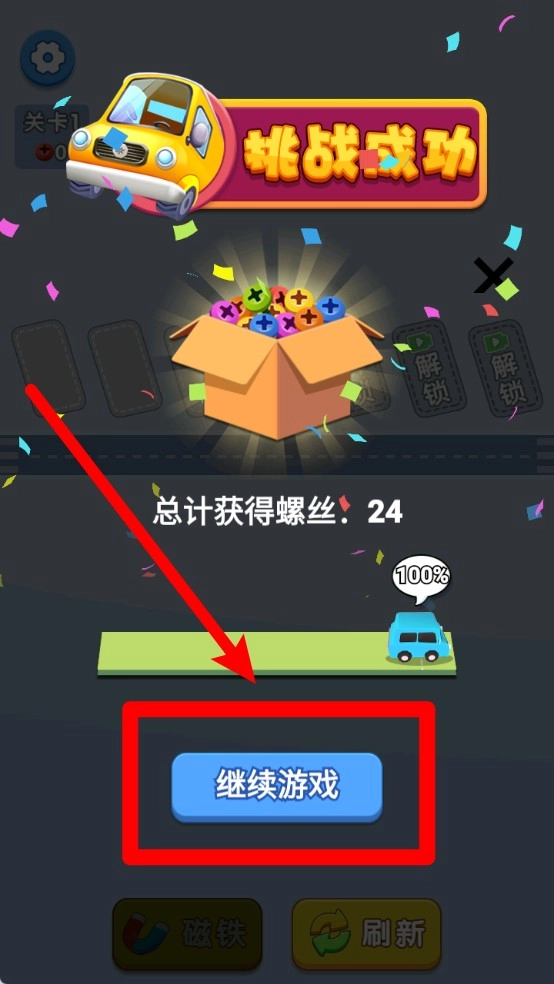 2.挑战成功画面会显示获得的螺丝数量,点击“继续游戏”按钮可进入下一关,挑战更高难度。