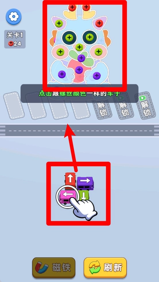3.根据上方图示提示,点击选取颜色与螺丝一致的车辆,即可顺利将其吸附带回完成任务。