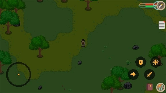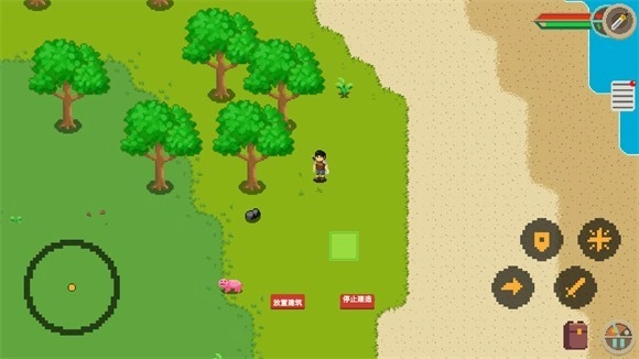 3、玩家创建好存档后,就能进入流浪荒岛的世界。左下方的操控区域用于控制角色移动,右下角的按键则可实现与场景物品互动、发起攻击等操作。