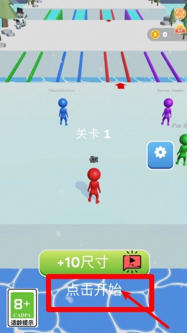 1. 点击底部的“点击开始”按钮就能进入关卡,部分按钮可以通过观看广告来获取额外奖励,比如雪球初始尺寸的加成。