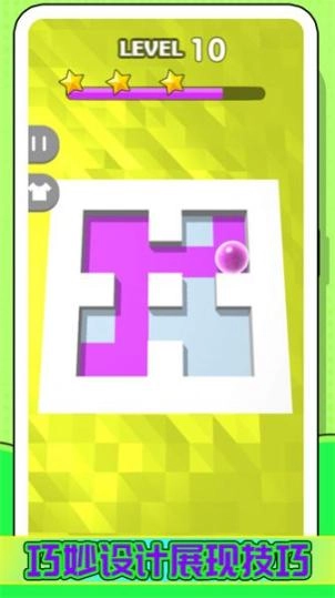 每次滑动会消耗固定的能量值,一旦撞击到障碍物就会失去轨迹控制权,需要在能量用完之前完成指定区域的色彩覆盖任务。