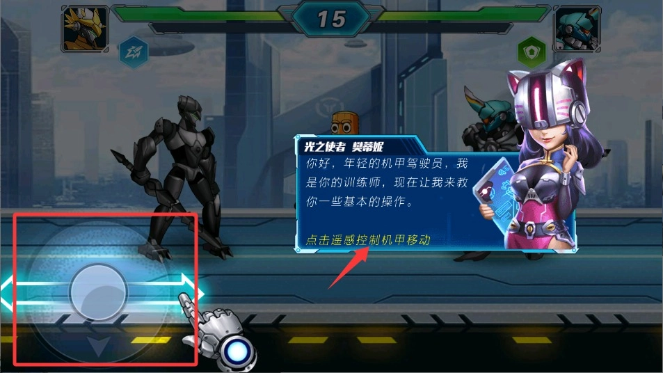 1、进入战斗界面后,按住屏幕任意位置滑动即可操控机甲移动,请注意观察地面红色警示区域,以躲避敌人攻击。