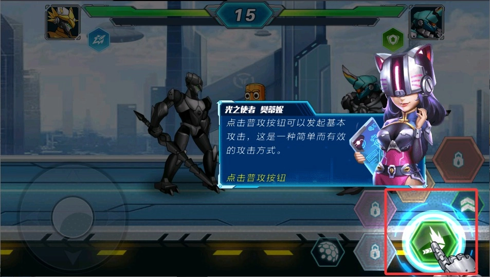 2、当发现目标时,迅速点击右侧的攻击按钮,机甲便会自动锁定距离最近的敌人;若连续点击该按钮,还能触发强力连招,从而造成额外伤害。