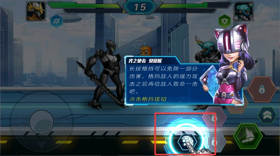 3、敌人释放大招的瞬间,要马上点击左下角的蓝色防御按钮。成功格挡后,不仅可以减少所受伤害,还能使敌人陷入短暂的僵直状态。