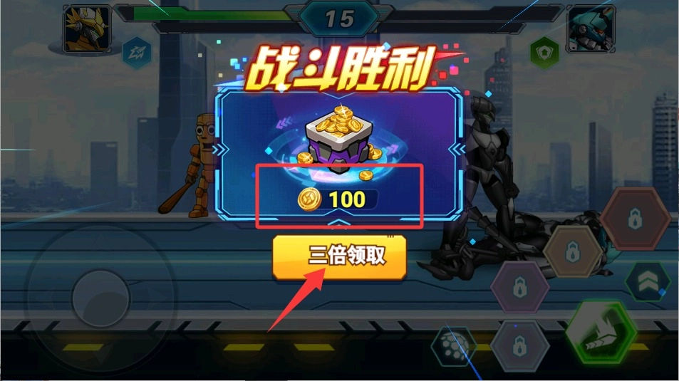 4、当你击败所有敌人后,系统会自动进行奖励结算,别忘了领取金币——这些金币可以用来升级机甲装备,或者解锁新技能,从而提升你的战斗力。