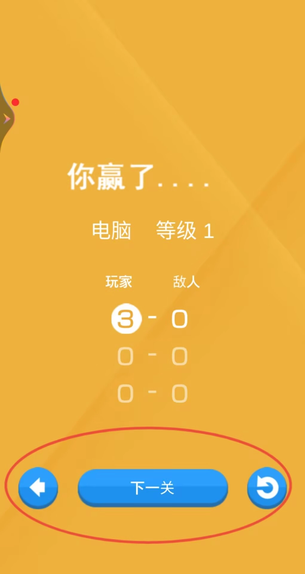 3、每局比赛采用三局两胜的规则,结束后会呈现本场的表现评级以及详细比分,借助界面上的按钮能够返回主菜单或者进入下一个关卡。