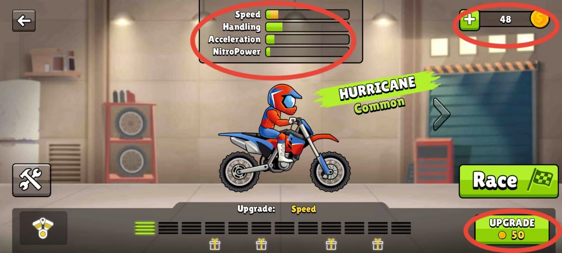 1、进入赛事界面后切换至改装页面,顶部展示摩托参数,右下角绿色按钮消耗金币进行部件强化,右上角显示持有金币数量。