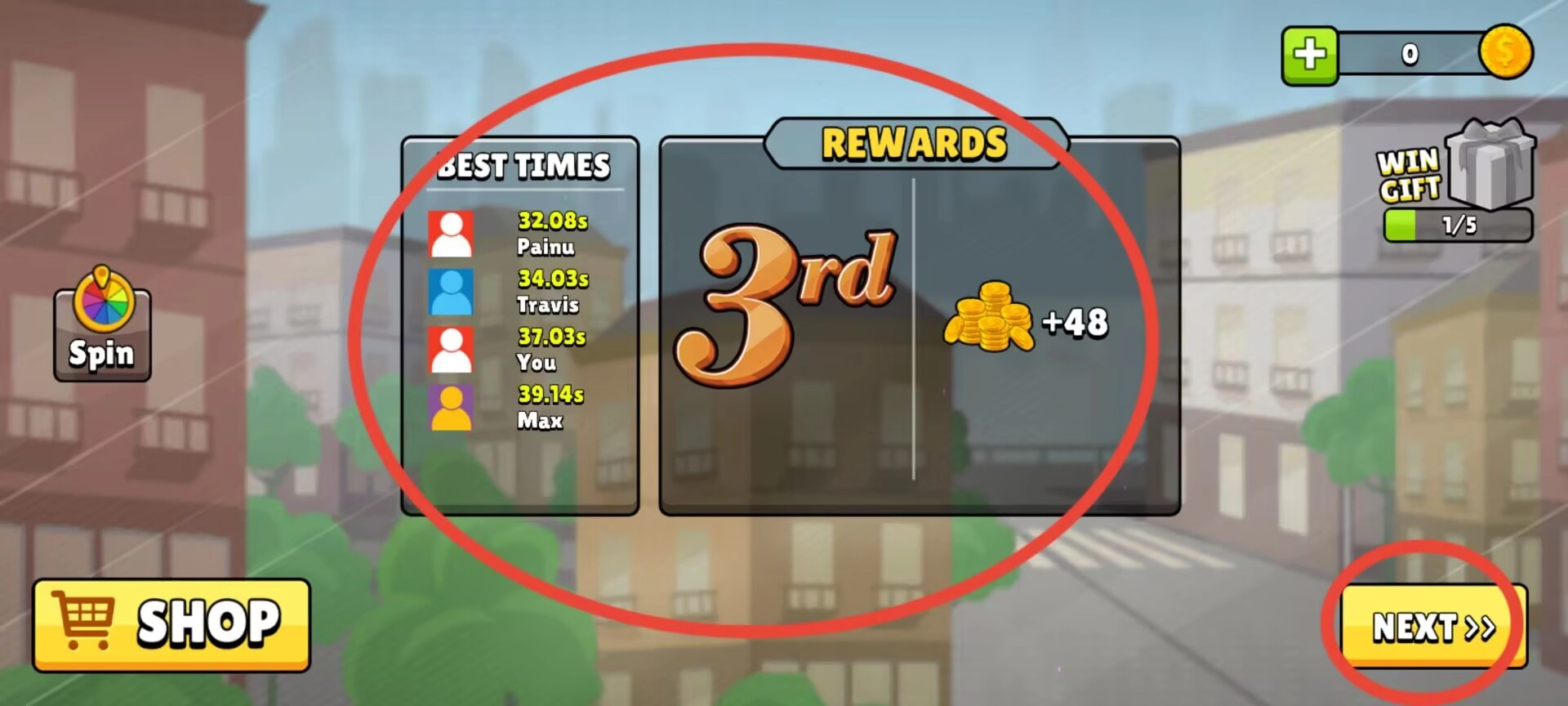 3、完成赛道需规避各类障碍物并收集沿途金币,终点结算界面公示最终排名与金币收益,通过右下角功能键可返回主界面。