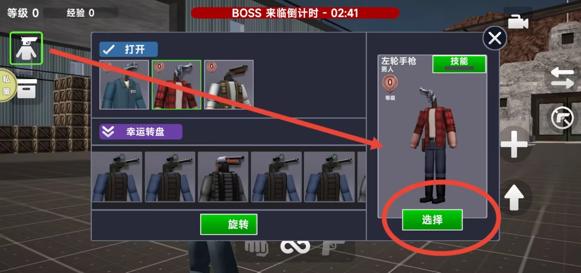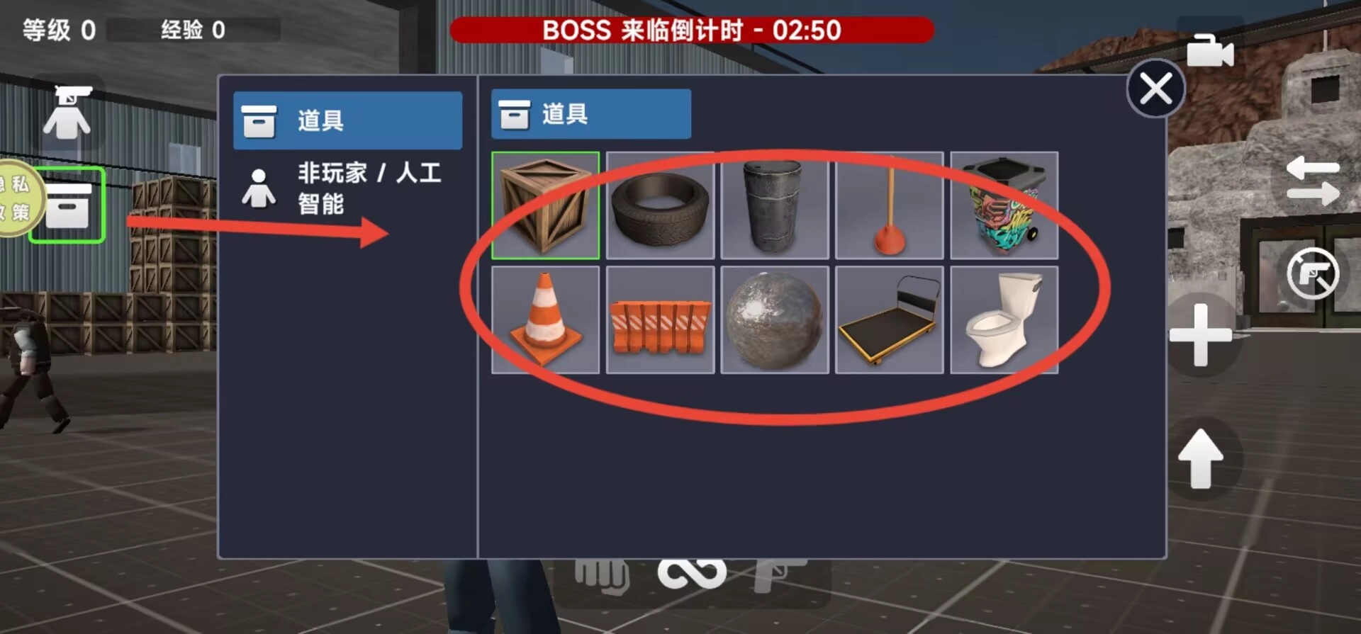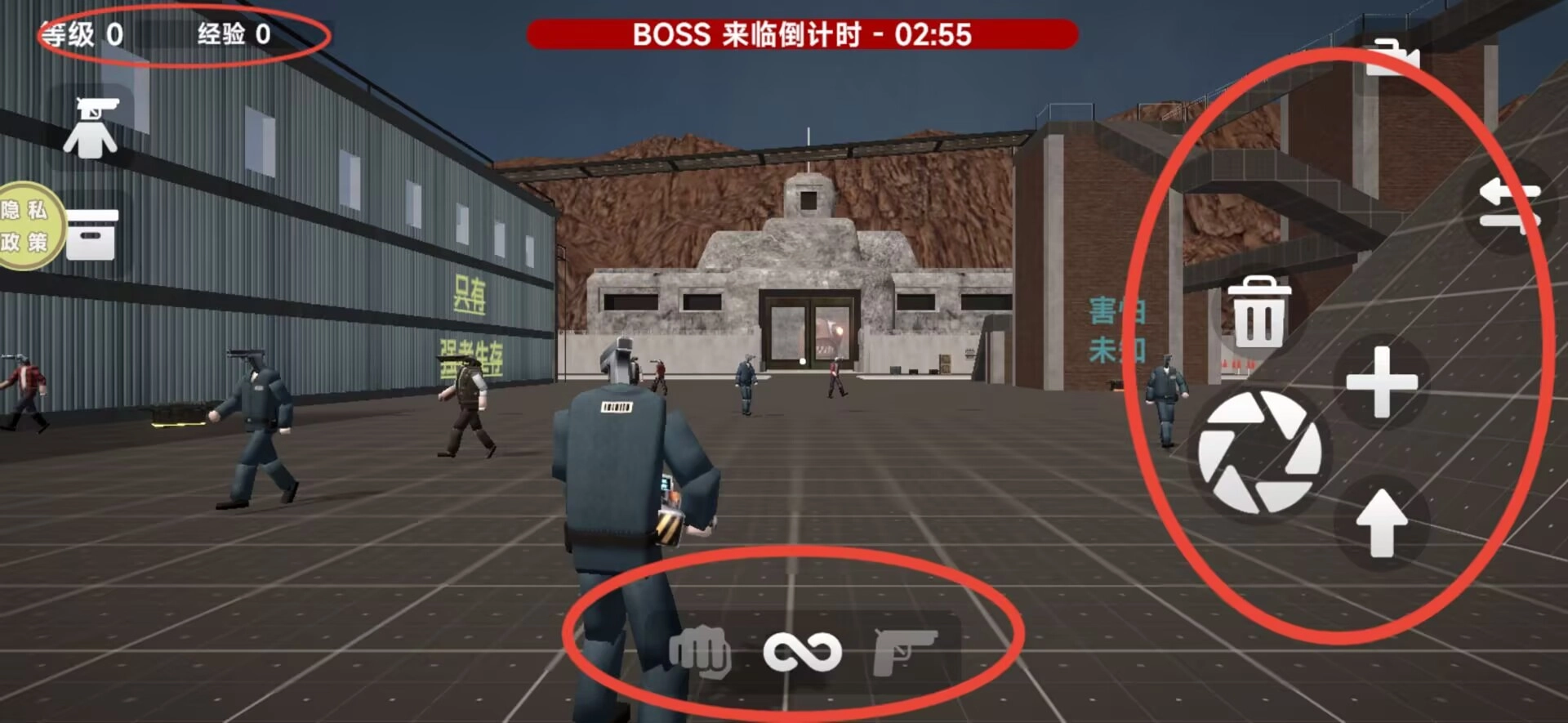 3、顶部状态栏会显示玩家等级和BOSS倒计时,底部能够切换武器类型,右侧功能区有跳跃、清除等操作按键。