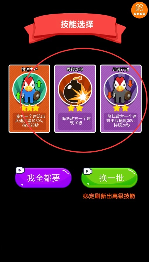 2、每次开局前可刷新技能选项,通过点击换一批按钮重新获取三个不同的技能组合选择。