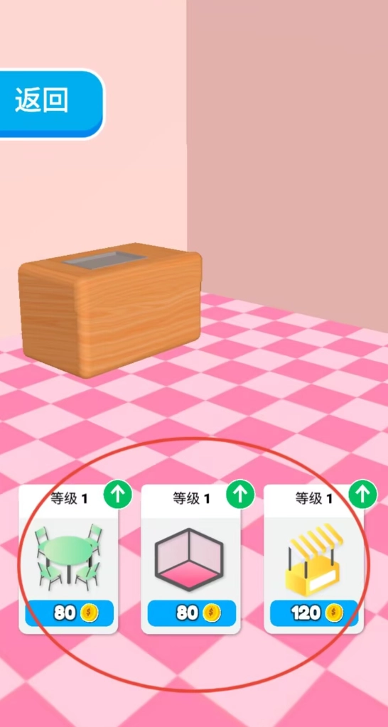 1、通过主界面箭头标识进入升级系统,消耗金币可提升餐桌等级、更换餐厅主题或扩展经营区域。