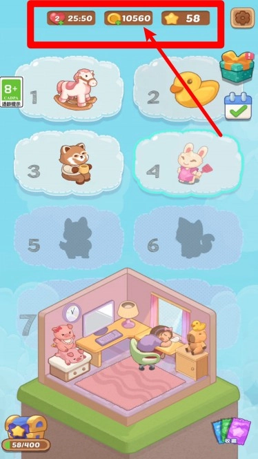 1.资源总览界面:画面上方显示体力、金币与星星数量,帮助玩家清晰掌握当前可用资源,便于合理规划每一步操作。