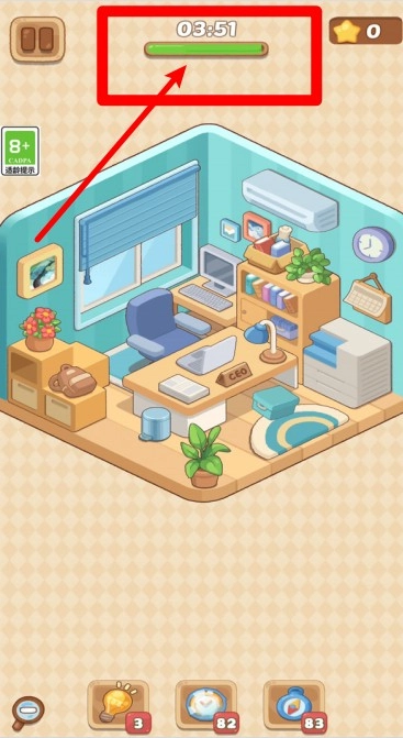 2.房间任务进度:画面中绿色进度条表示任务时间推进,玩家需耐心等待或使用道具加速,提升整体效率与节奏感。