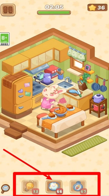 3.厨房场景互动:下方按钮提供不同功能道具,包括提示灯泡、时钟等,使玩家能自由控制流程与完成房间布置。