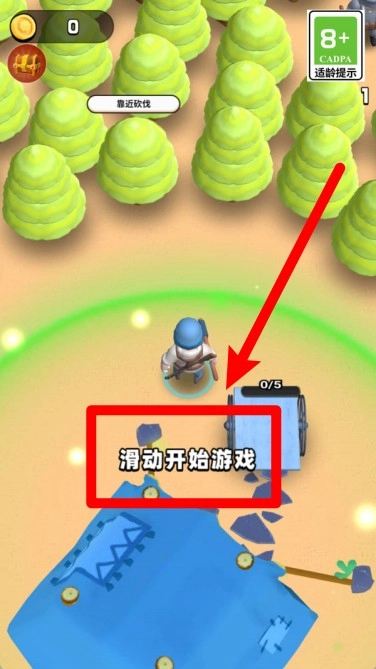 1.滑动屏幕开始游戏,操控角色进入冒险状态,快速收集周围的木材,为接下来的战斗和建造提供基础资源。