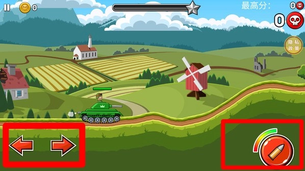 2.基础操作指引:左下方的虚拟按键用于操控坦克前进和后退,右侧按钮能够精准发射炮弹,战斗操作直观且容易上手。