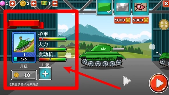 3.强化系统详解:在车库中可使用金币进行坦克升级,提升护甲、火力与引擎属性,应对更强敌人毫不费力。