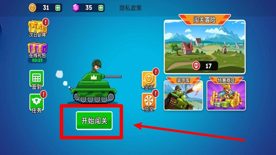 1.开启闯关模式:玩家点击“开始闯关”后,即可驾驶坦克驶入各类冒险场景,通过灵活操控来完成关卡挑战,感受多样的趣味玩法。