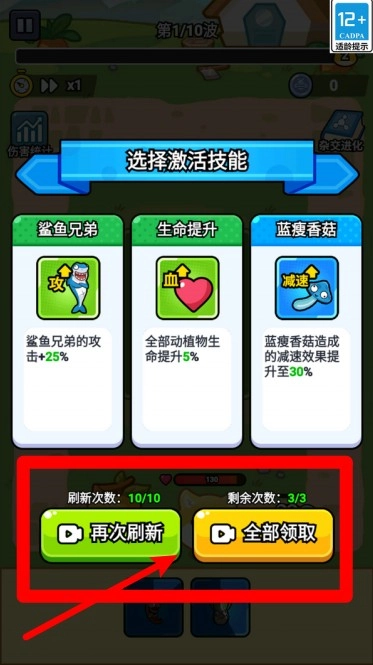 3.界面下方显示刷新次数与剩余次数,点击“再次刷新”可获取新的技能选择,点击“全部领取”可直接领取已选技能。