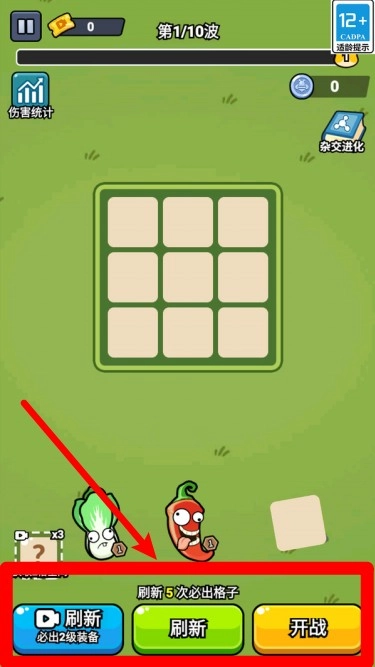 1.战斗准备界面底部有三个按钮,“刷新”可必出高级装备,“刷新”用于普通刷新,“开战”开始当前关卡。