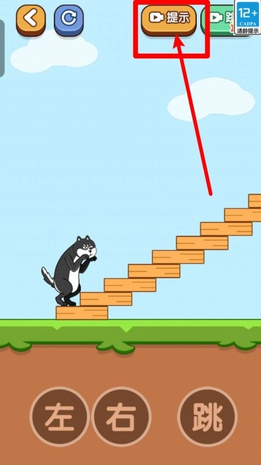 1.点击屏幕右上角的提示按钮,可通过观看视频获取过关提示,帮助狗狗顺利登上高高的阶梯。