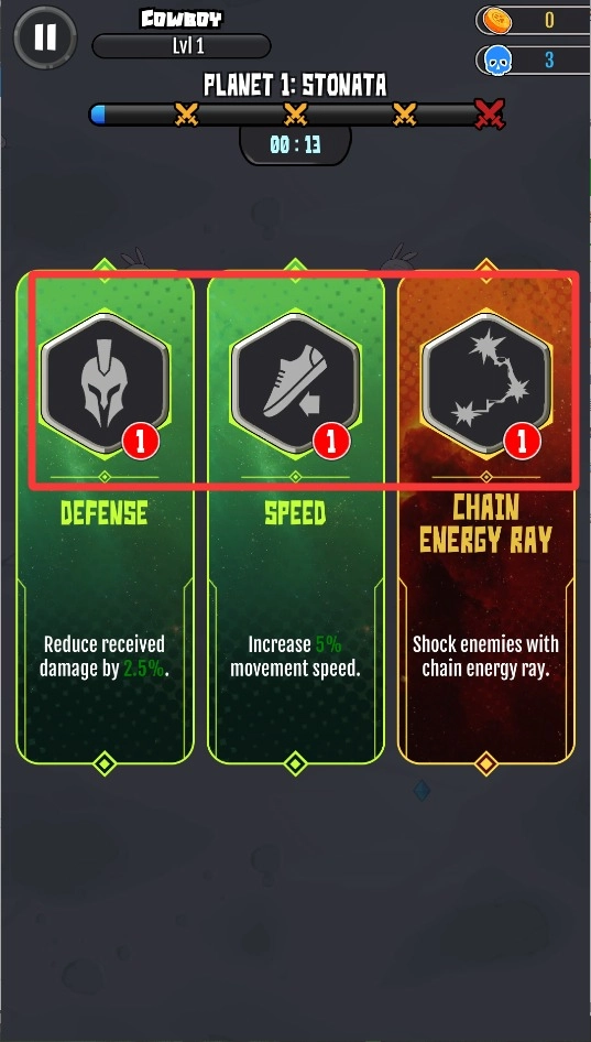 3、击败怪物后会随机掉落属性加成类道具,点击拾取后,可从攻击力、攻击速度、生命值等不同强化方向中进行选择。
