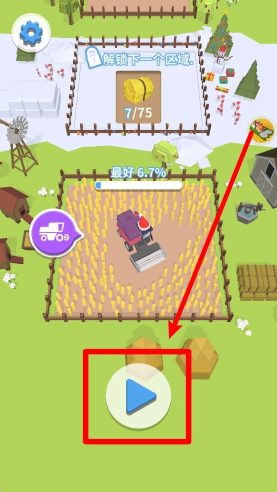 1. 启动游戏:点击下方的播放按钮进入割草玩法,操控收割机在田地里快速割除草丛,达成目标就能解锁更多区域。