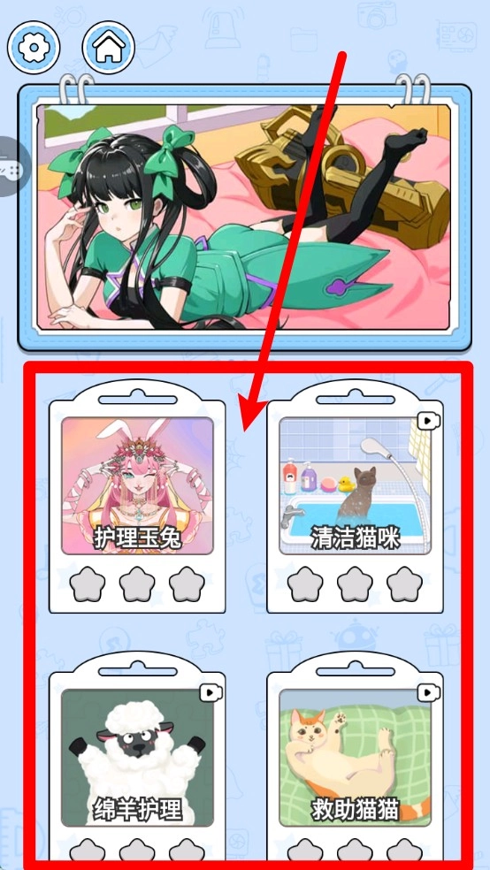 1.任务关卡选择:主页界面展示多个主题任务,如护理玉兔、清洁猫咪等,玩家可自由选择喜欢的项目进行挑战。