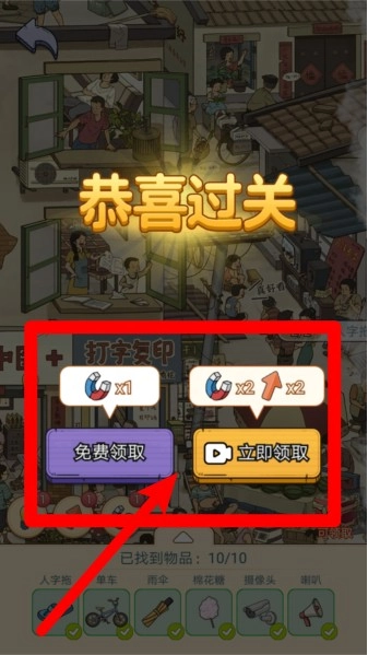 3.通关奖励领取:完成关卡后可选择免费领取基础奖励,或观看广告获得双倍资源,奖励分明便于自由选择资源获取方式。