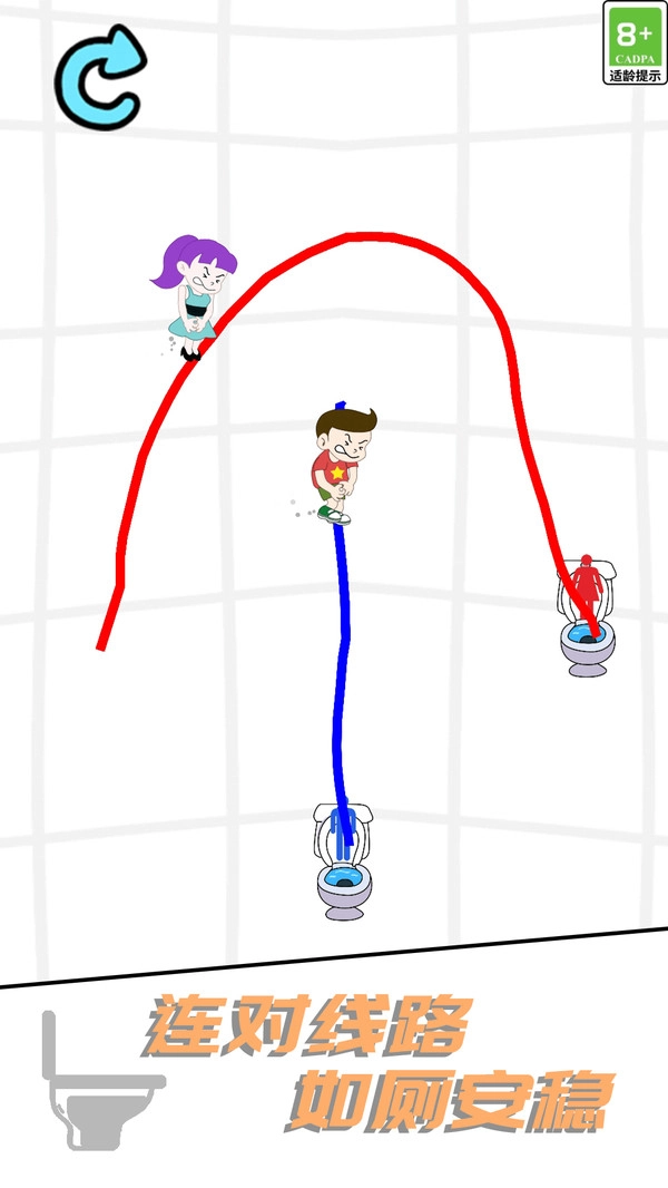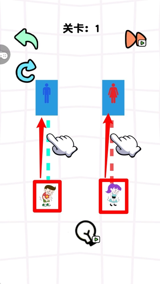 2.画线匹配:用手指拖动画线,引导男女角色顺利前往对应厕所,避免错误路线导致失败。