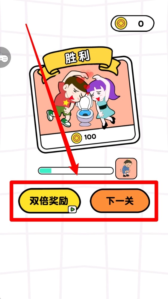 3.奖励选择:通关后可点击双倍奖励按钮,通过观看广告获取额外金币,或直接进入下一关继续挑战。