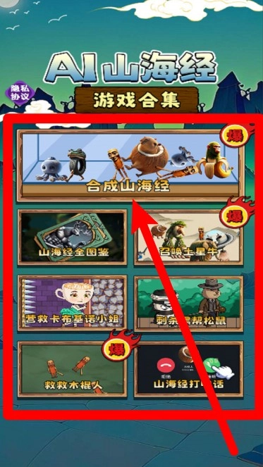 主界面设有多种模式选项,玩家可选择进入合成山海经、召唤怪物或其他趣味小游戏,感受丰富多元的玩法体验。