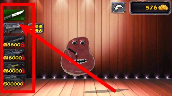 2.武器选择:左侧设有刀具、枪械等多种武器选项,玩家能够自主挑选不同武器来恶搞牛排,以此获得趣味十足又紧张刺激的游戏体验。