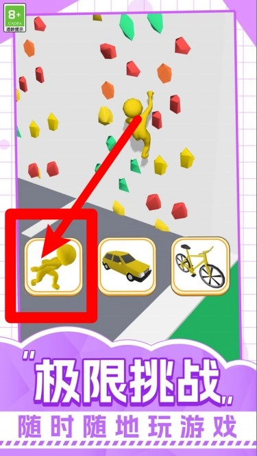 2.徒步攀爬:角色在彩色岩点墙壁上攀爬,切换徒步模式掌握节奏技巧,感受趣味十足的挑战玩法。