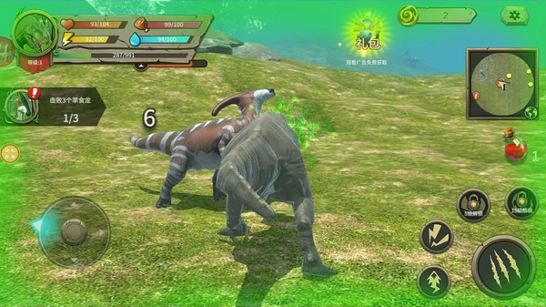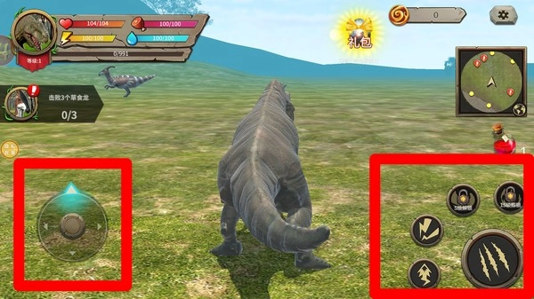 3.操作与技能:左下虚拟摇杆负责移动和转向,右侧按钮含冲刺、吼叫与撕咬等技能;把握冷却节奏先控后打,必要时绕背或迅速撤离。