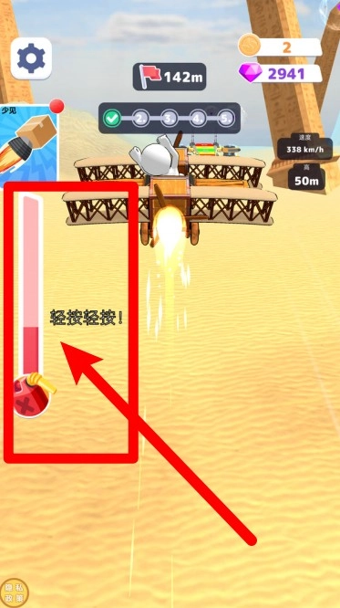 3.飞行途中引擎喷射强烈火焰推动前行,左侧能量槽显示实时加速状态,提醒玩家轻点屏幕保持最佳飞行节奏。