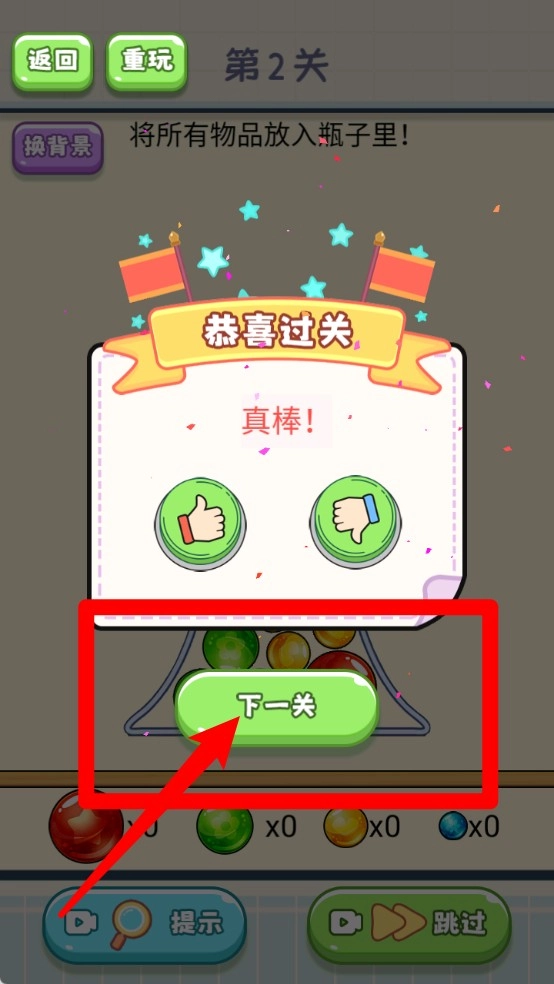 1.闯关挑战提示:点击下一关按钮,轻松进入全新关卡,享受源源不断的烧脑挑战与智力碰撞乐趣。