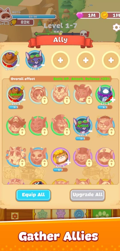 2、借助战斗赢得经验与金币,用来提升猫咪的等级、技能以及装备。