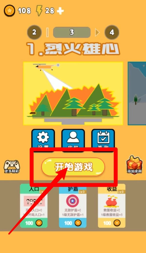 1.主界面显示不同主题关卡与开始按钮,可点击"开始游戏"进入,同时还能在下方升级人口护盾和收益属性增强通关效率。