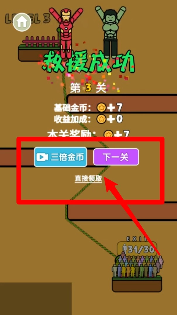 3.完成任务后会显示救援成功与奖励金币,可以选择直接领取或观看视频获取三倍金币,增加成长速度与挑战动力。