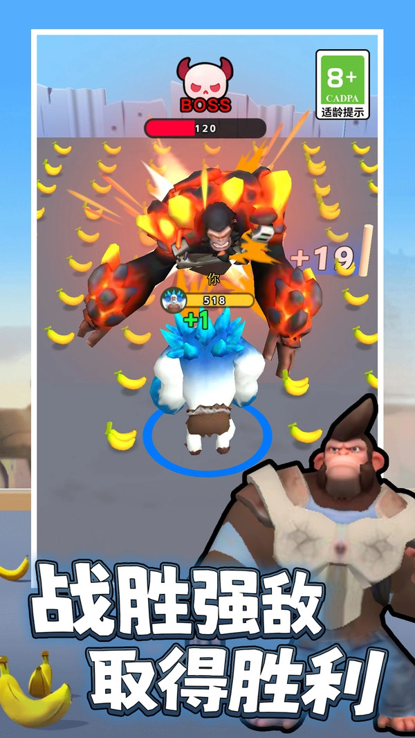 2.灵活进化:能量积累到一定程度角色将进化,进化后的猩猩不仅更强大,还能释放强力技能,提升战斗力。