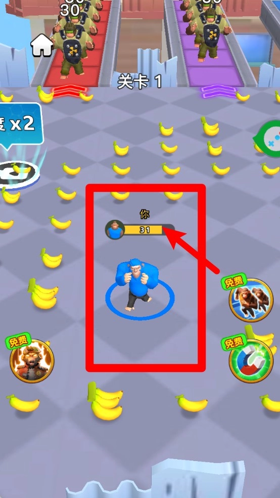 2.能量收集过程:通过控制角色在场地中不断拾取香蕉来积累能量,能量越高战斗力越强。